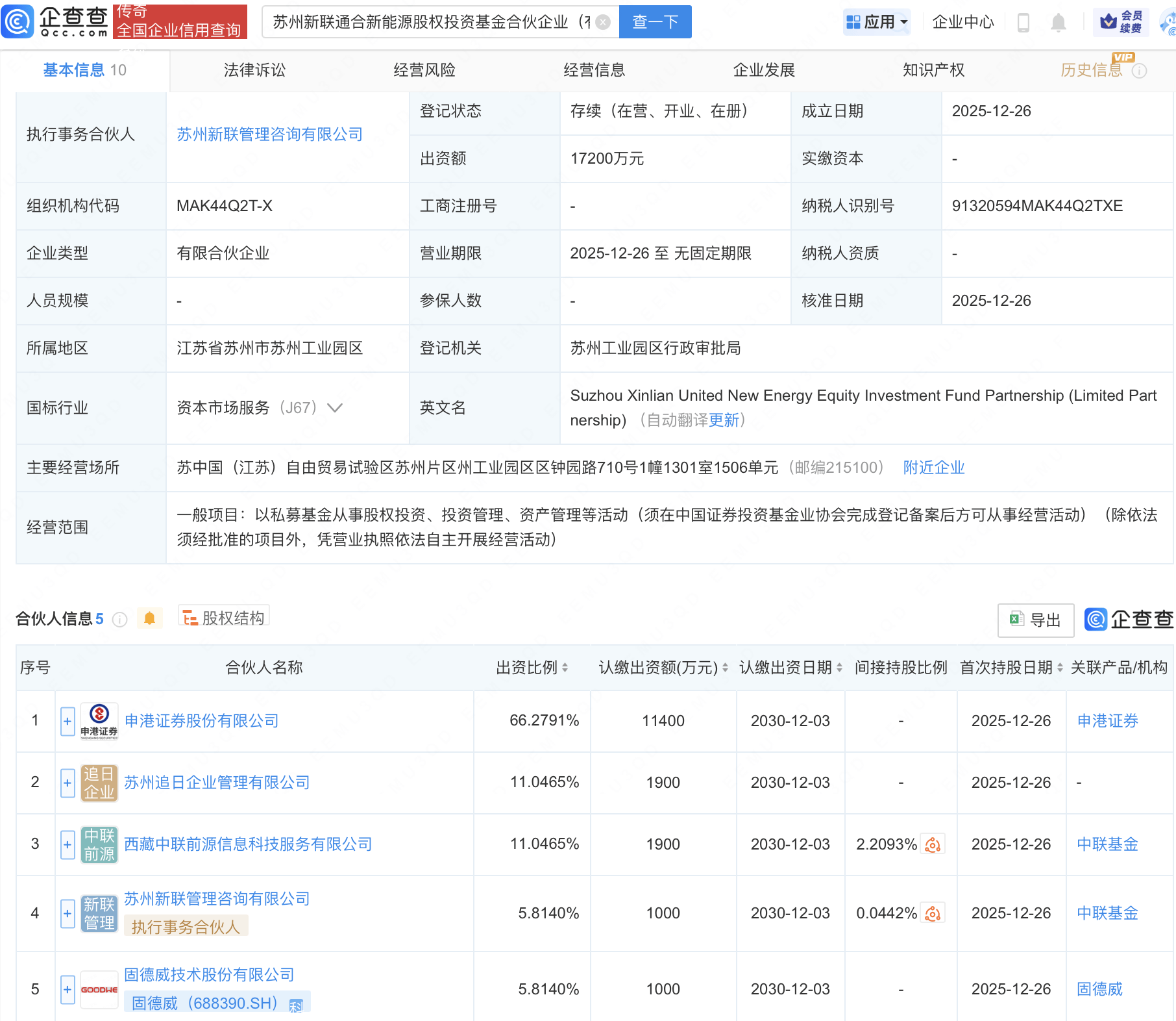 企查查APP显示,近日,苏州新联通合新能源股权投资基金合伙企业(有限合伙)成立,经营范围包含:以私募基金从事股权投资、投资管理、资产管理等活动。企查查股权穿透显示,该企业由固德威(688390)等共同出资。