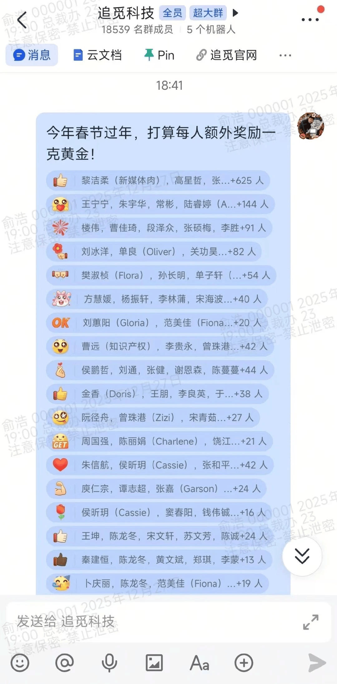 多家媒体转述的网传内部群截图显示,追觅创始人兼CEO俞浩在群内提到:在年终奖之外,将向员工每人额外发放 1 克黄金;按截图口径推算,涉及人数约1.85万人,若以金饰克价约1400元/克测算,这笔“黄金奖励”总成本约在2500–2600万元区间,对应黄金总量约18.5kg(约37斤)。