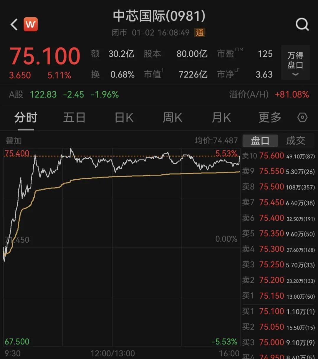 Wind数据显示,1月2日,中芯国际H股大涨5.11%,收盘报75.1港元/股,市值7226亿港元。