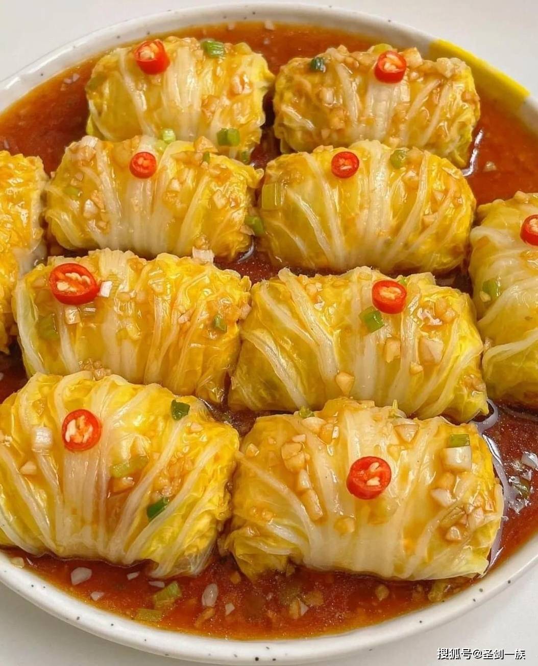 4. 将蒸好的白菜卷取出,淋上酱汁,撒上葱花即可。鲜香软嫩,层次丰富。