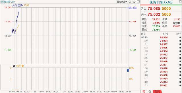 现货白银向上触及75美元/盎司,日内涨超3%。
