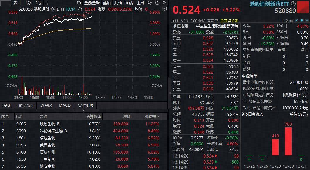 1月5日午后,港股通创新药板块维持强势,创新药纯度100%的港股通创新药ETF(520880)弹性十足,放量大涨5.22%!场内快速成交4亿元,较前一交易日放量近200%!
