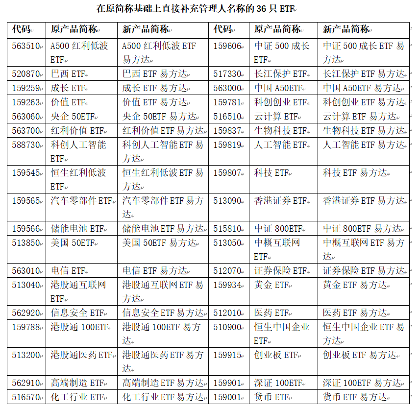 从本次45只ETF的调整细节来看,除直接在原简称后补充管理人名称外,有9只产品还同步修订了“投资标的核心要素”,进一步提升简称直观性。例如,对于通过港股通机制投资港股的行业主题ETF,在简称中加入“港股通”字样,如将跟踪恒生港股通创新药指数的“恒生创新药ETF”调整为“港股通创新药ETF易方达”;去掉冗余汉字或数字,如将跟踪科创50指数的“科创板50ETF”调整为“科创50ETF易方达”,将跟踪科创成长指数的“科创成长50ETF”更名为“科创成长ETF易方达”。