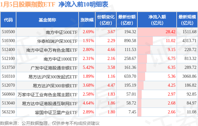 当日有148只股票指数ETF基金出现资金净流入,其中净流入排首位的是南方中证500ETF(510500),份额增加了3.67亿份,净流入额为28.42亿元。