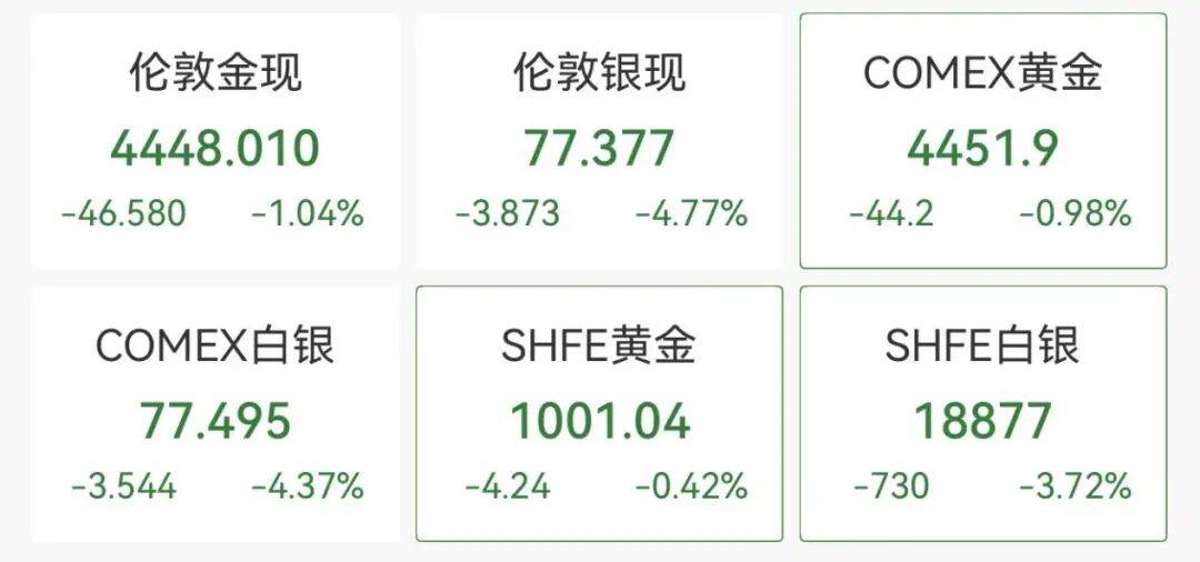 现货白银在突破80美元/盎司后,今日短线走低,现报77.44美元/盎司,日内跌4.69%。