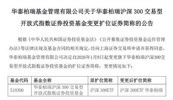 1月7日,华泰柏瑞基金发布公告,宣布旗下沪深300ETF的场内扩位简称自1月9日起变更为“沪深300ETF华泰柏瑞”。这只产品是全市场规模最大的股票ETF,资产管理规模超过4000亿元,其更名动向迅速成为市场焦点。