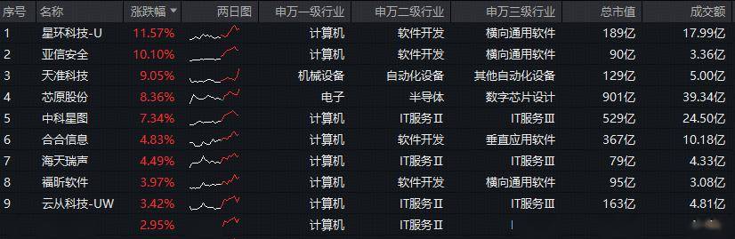 成份股方面,AI应用概念股显著领涨,星环科技涨超11%,亚信安全涨逾10%,天准科技涨超9%,芯原股份涨逾8%,中科星图、合合信息、福昕软件等个股跟涨。权重股方面,寒武纪涨超2%,金山办公涨逾3%。