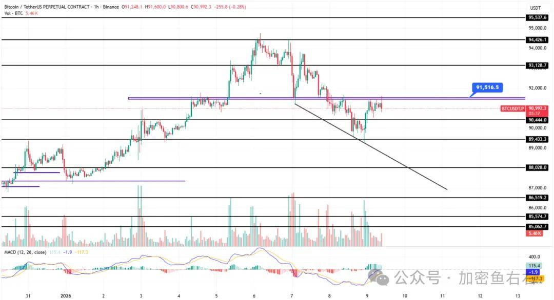 (1)小时图已经连续多次试探91500附近压制,MACD多头能量不足,持续缩量,行情或许回调在8.83附近才会形成反弹向上;
