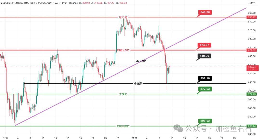 ZEC核心开发团队全体离职,短时跌超18%,4小时图上几乎连续收了近10根阴线,ZEC做空的机会在上方两个压力位449、474附近可以选择介入空单(分两笔进也可以),不管这俩选哪个位置做空,止损应该设置在4H级别紫色上升趋势线上方(当前在488上方)。