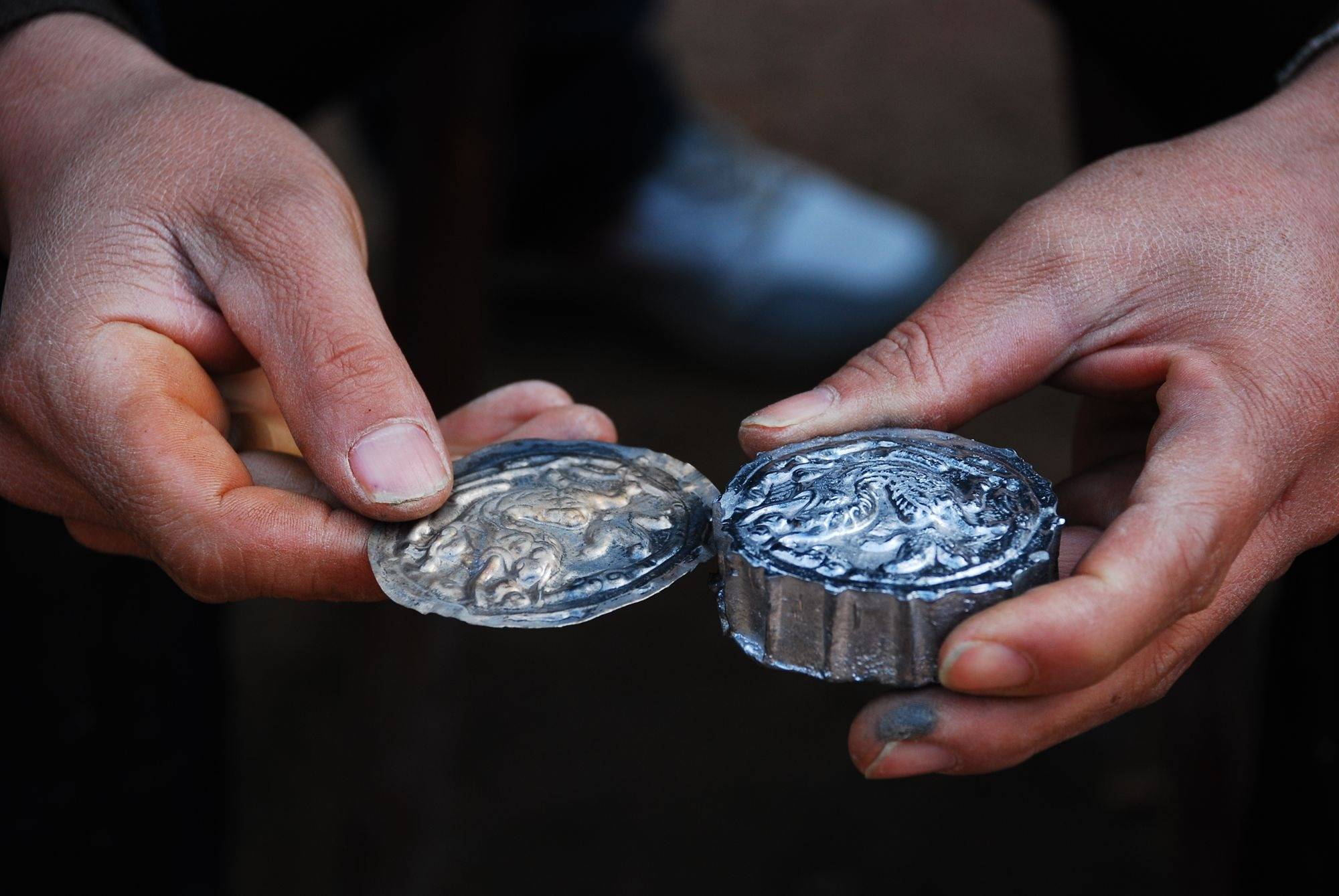 融化的银料倒进模具,经过5到10轮的锻打和退火,最终形成银饼,每一步都是手工制作,对温度和锻打力度的控制全靠匠人的手感和经验,而这只是银饰制作的基础,之后还有繁琐的几十道工序。