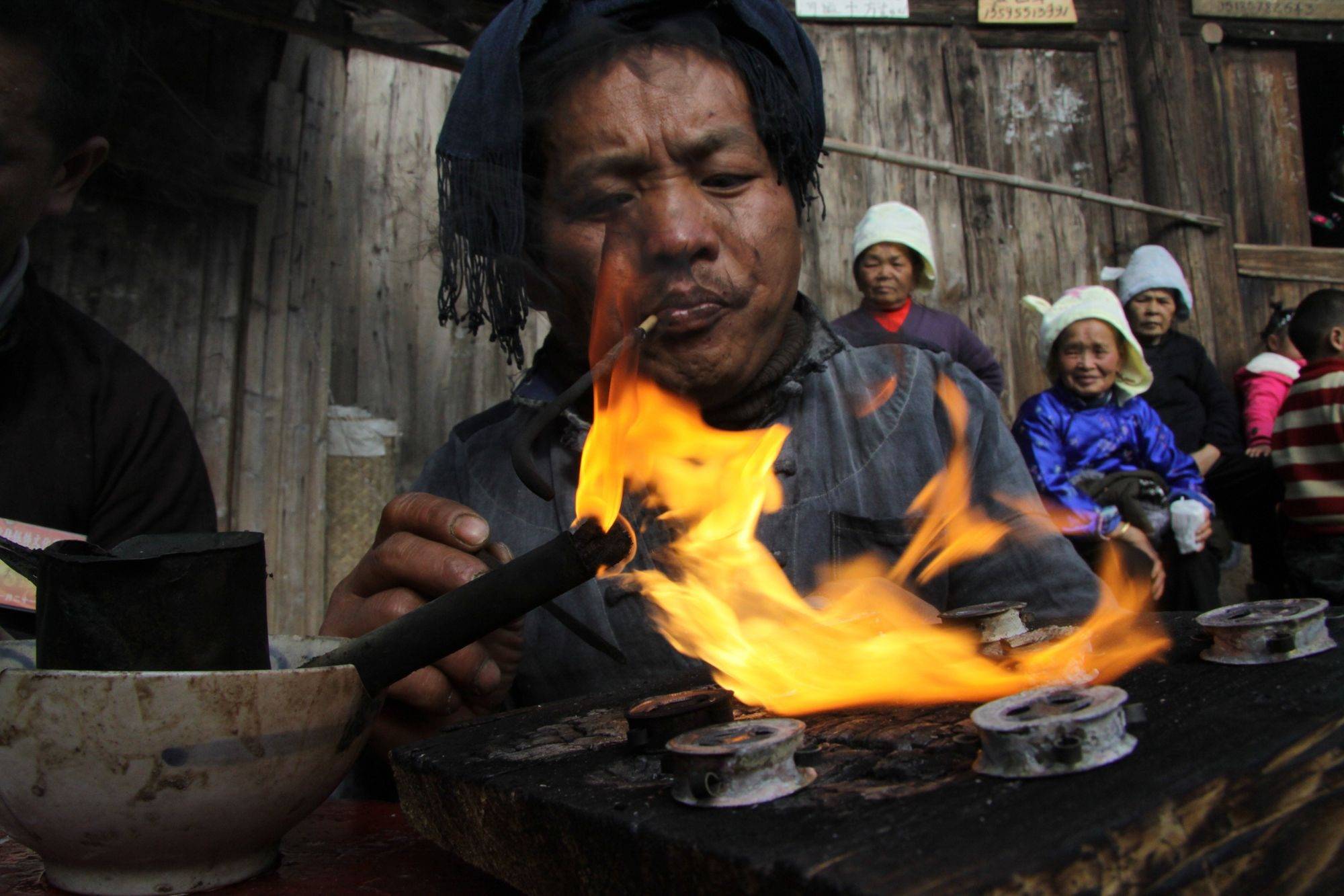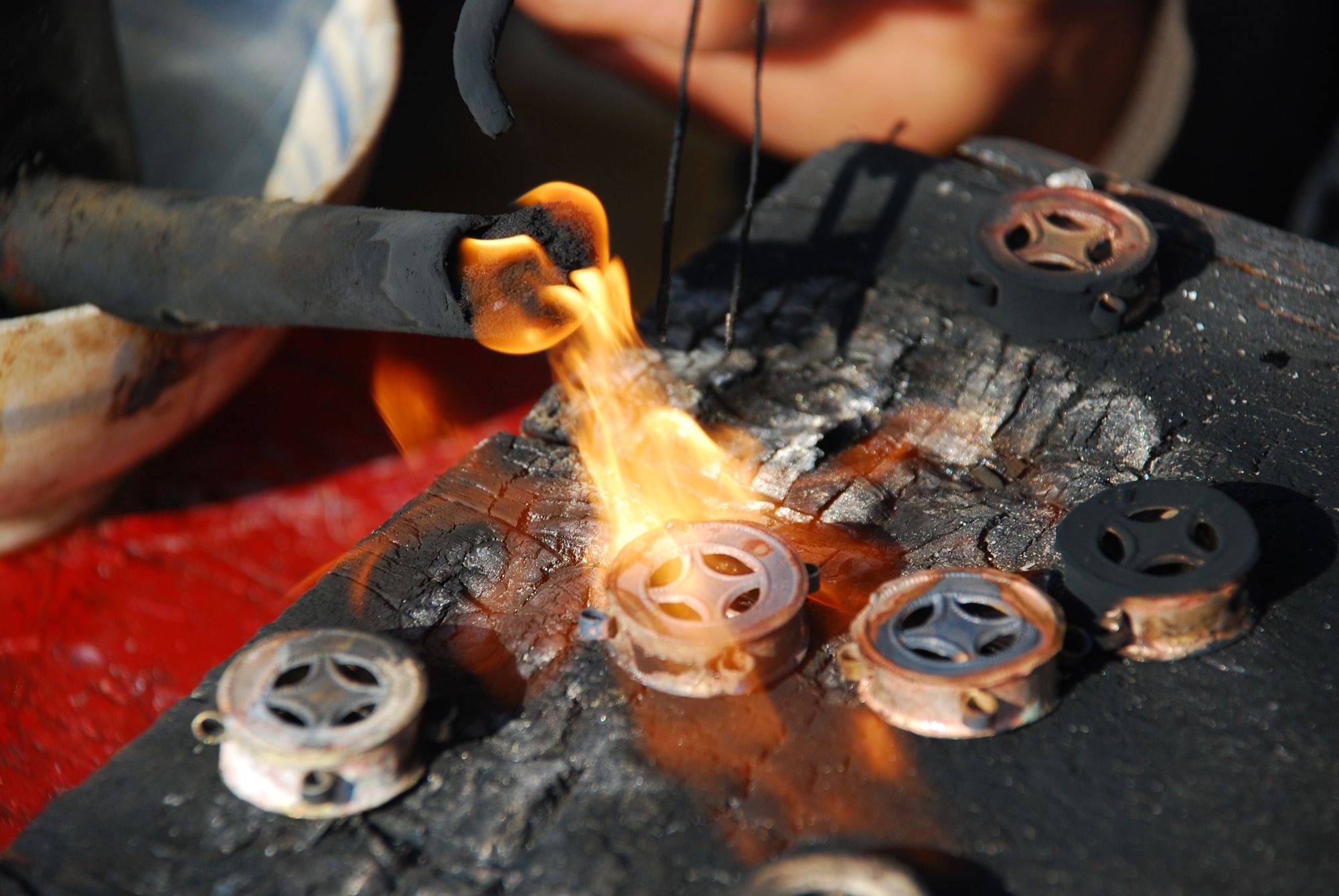 匠人在炉边熔银,这是制作银饰的第一步,喷火枪喷出灼热火焰,火星噼啪作响,银料随之慢慢融化,看似简单的过程其实需要对火候的精准把控。