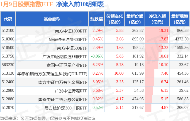 【ETF观察】1月9日股票指数ETF净流入145.08亿元