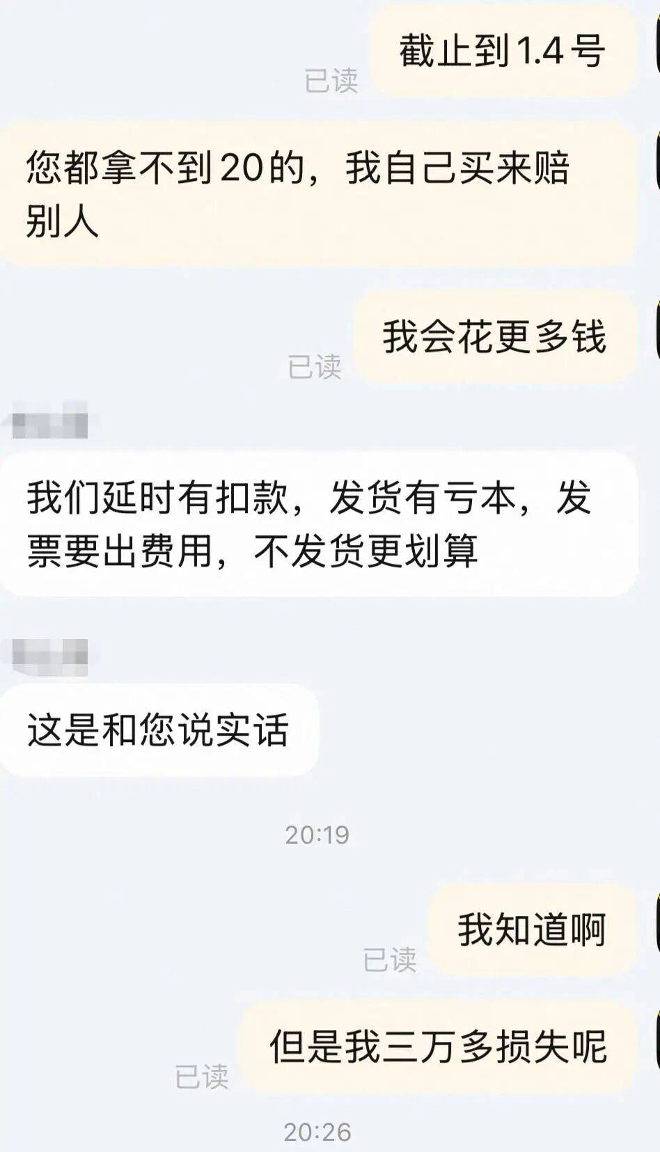 她向记者展示了与商家的聊天记录,对方起初以“缺货”“按订单顺序发货”等说辞搪塞,随着张女士的反复催促,商家的回复愈发强硬,甚至直言“越催越不发”“延时有扣款、发货有亏本、发票要出费用,不发货更划算”。