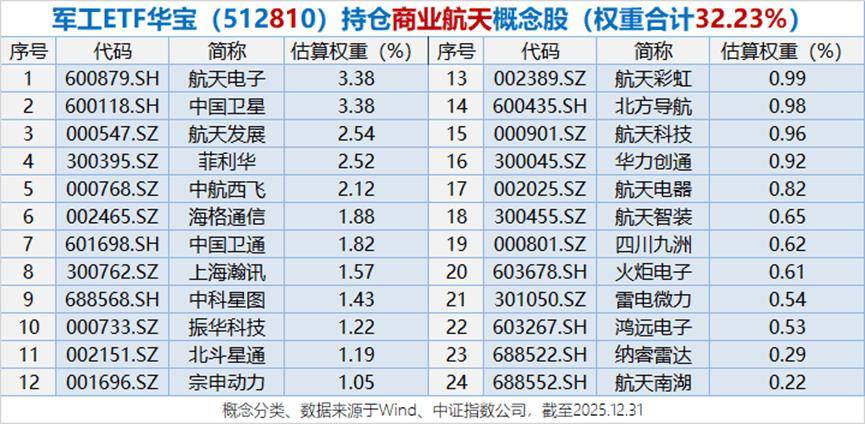 据统计,军工ETF华宝(512810标的指数中证军工覆盖24只商业航天概念股,权重合计超32%