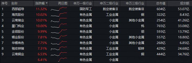 成份股方面,为商业航天提供有色金属的龙头股显著领涨,为卫星红外探测器提供锗基材料的云南锗业、为卫星防护涂层提供钨合金的厦门钨业、为火箭发动机高温部件提供钼材料的金钼股份携手涨停,为箭体/卫星结构件提供钛合金的西部超导涨超11%。此外,海亮股份亦涨停,金钼股份、锡业股份等个股大幅跟涨。