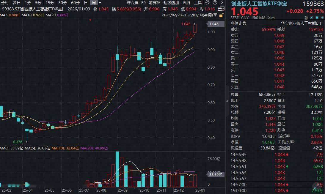 热门ETF方面,流动性突出的创业板人工智能ETF159363)场内收涨2.75%,再创上市新高,放量成交7亿元!单周复盘看,创业板人工智能ETF159363)周线斩获七连阳,标的指数区间累涨29.32%。(统计区间2025.11.28-2026.1.9)