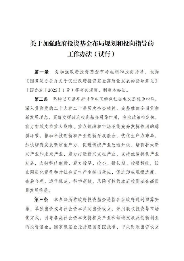 为贯彻落实党中央、国务院决策部署,根据《国务院办公厅关于促进政府投资基金高质量发展的指导意见》(国办发〔2025〕1号)要求,加强对政府投资基金布局规划和投向指导,更加突出政府引导和政策性定位,现制定《关于加强政府投资基金布局规划和投向指导的工作办法(试行)》。现印发给你们,请按照执行。