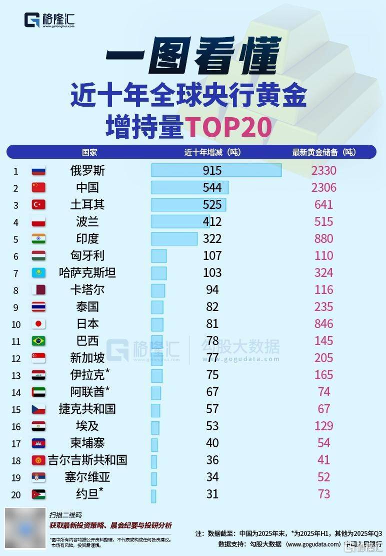 数据显示,与2015年末时的黄金持仓量相比,中国央行近十年累计增持黄金544吨,位列全球第二,仅次于俄罗斯(915吨)。