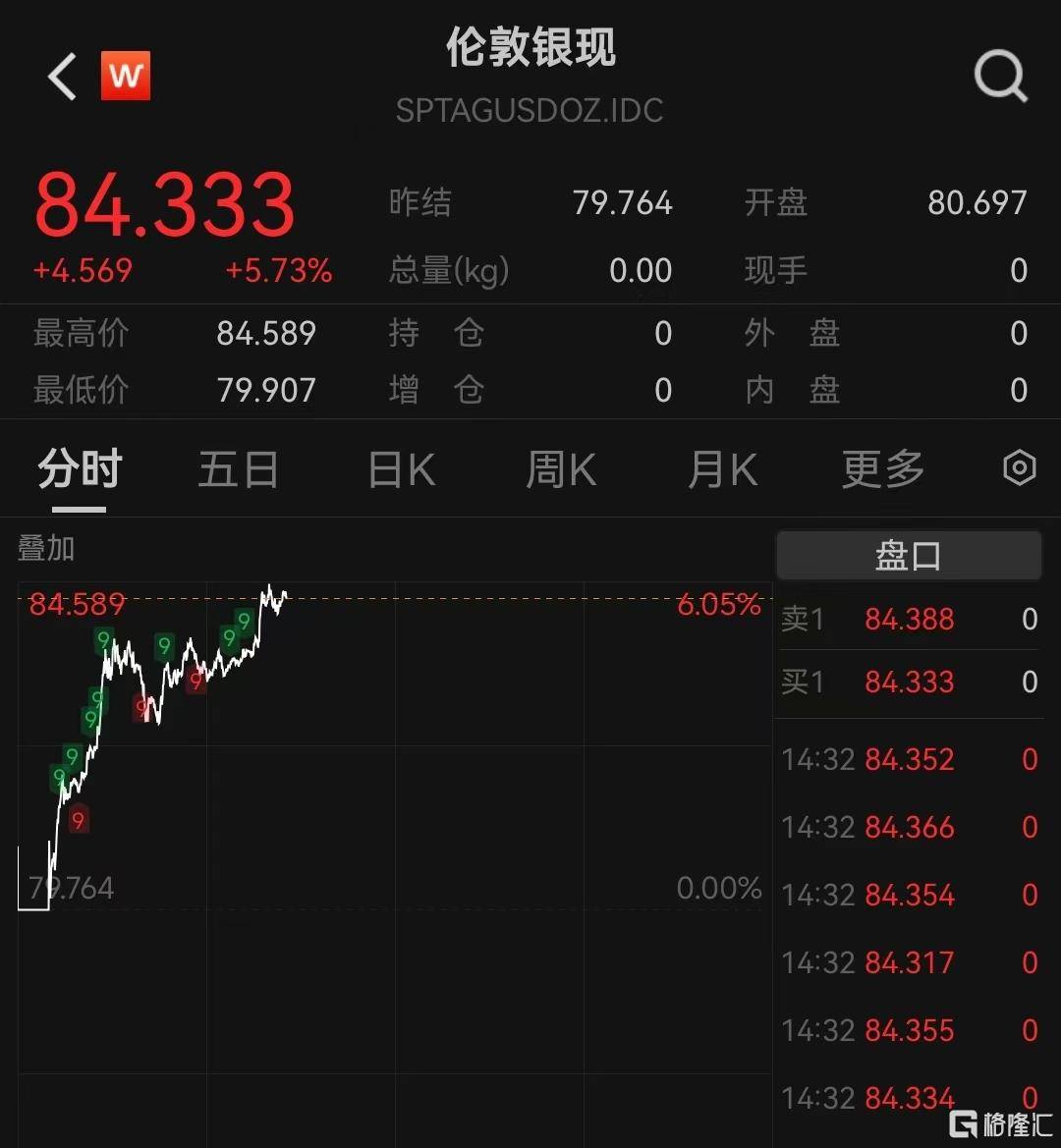 与此同时,现货白银最高冲击84.589美元,再创历史新高。COMEX白银大涨逾6%冲击84美元。