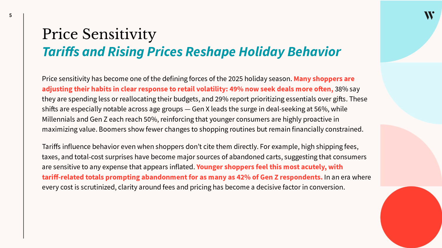 价格敏感性成为核心消费驱动力。49% 的消费者更频繁地寻找优惠,38% 减少支出或重新分配预算,29% 优先考虑必需品而非礼品。年龄层面,X 世代的优惠寻求比例最高(56%),千禧一代和 Z 世代均为 50%,婴儿潮一代消费习惯虽变化较小但财务受限。关税的间接影响显著,高额运费、税费等成为购物车放弃的主要原因,42% 的 Z 世代会因关税相关成本放弃购买,定价透明度成为转化关键。