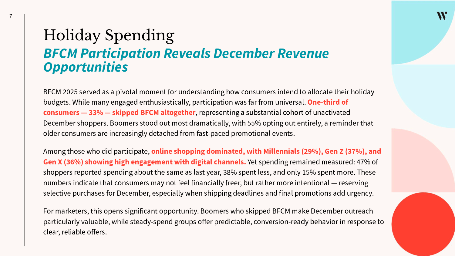 假日消费呈现结构性特征。黑色星期五 / 网络星期一(BFCM)参与度不均,33% 的消费者选择跳过,其中婴儿潮一代占比 55%。参与者中线上购物占主导,千禧一代(29%)、Z 世代(37%)和 X 世代(36%)数字渠道参与度高,但消费更趋理性:47% 支出与去年持平,38% 减少支出,仅 15% 增加支出。消费动机方面,35% 为严格控制预算,30% 受优质优惠驱动,而 29% 认为折扣后价格仍过高;50% 因税费、运费放弃购物车,45% 认为折扣力度不足。
