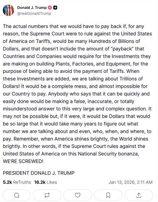 综合央视新闻报道,当地时间1月12日,美国总统特朗普在其社交媒体“真实社交”发文表示,如果美国最高法院出于任何原因做出对美国不利的关税裁决,美国将要面临实际金额数千亿美元的赔偿。