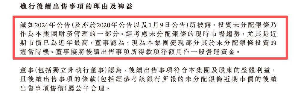 1月9日,公司以2.26亿元出售40万安士银条,约12.44吨,平均成交价每安士565.5元;1月12日,以1.62亿元售出28万安士银条,约8.71吨,平均成交价进一步升至每安士577.5元。两笔交易完成后,公司持有的约21吨银条已全部变现,相较于2024年底的账面值,净赚2.47亿元。