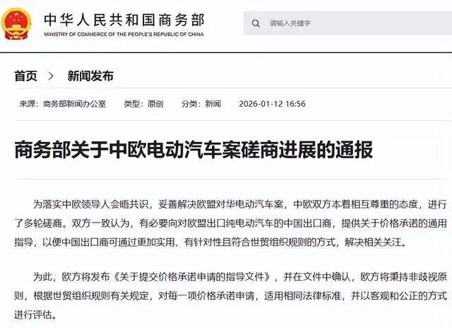 中国商务部在周一也发布通报称,双方一致认为,有必要向对欧盟出口纯电动汽车的中国出口商,提供关于价格承诺的通用指导,以便中国出口商可通过更加实用、有针对性且符合世贸组织规则的方式,解决相关关注。