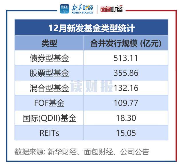 从产品发行结构来看,12月债券型基金发行规模最大,达到513.11亿元。股票型基金、混合型基金发行规模紧随其后,分别为355.86亿元、132.16亿元。此外,12月FOF基金发行规模达到109.77亿元。