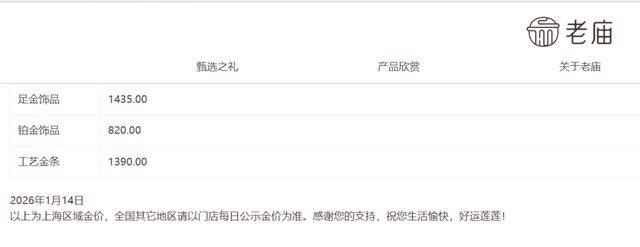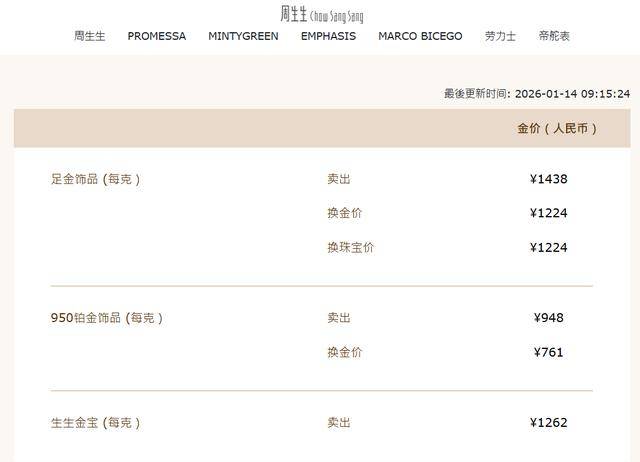 国内品牌金饰价格14日也延续上涨趋势。中新经纬查询发现,周生生金饰报1438元/克,单日上涨6元/克;老庙黄金报1435元/克,单日上涨8元/克;老凤祥报1436元/克,单日上涨8元/克。