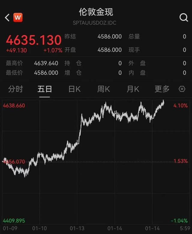 14日,现货黄金(伦敦金现)强势拉涨,盘中最高逼近4640美元,再创历史新高。截至发稿,报4635.130美元/盎司,涨超1%;COMEX黄金期货涨近1%,报4641.1美元/盎司。