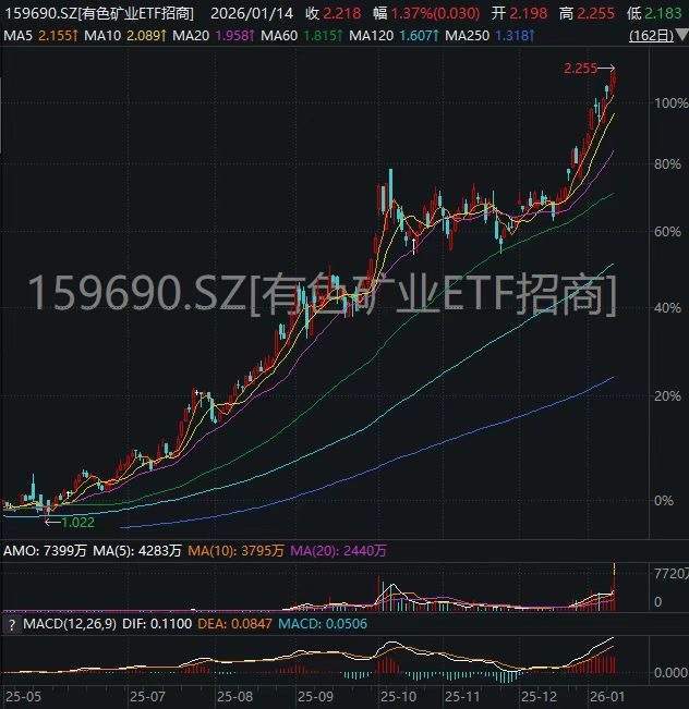 1月14日,有色板块持续强势。数据显示,截至13时38分,“周期放大器有色矿业ETF招商(159690)放量涨1.23%冲击四连升。成分股湖南白银、白银有色、兴业银锡、锡业股份涨幅居前。