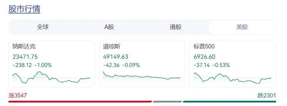 美东时间周三,美股三大指数连续第二个交易日下跌。截至收盘,道指跌0.09%报49149.63点,纳指跌1%报23471.75点,标普500指数跌0.53%报6926.6点。