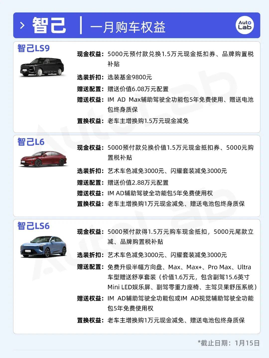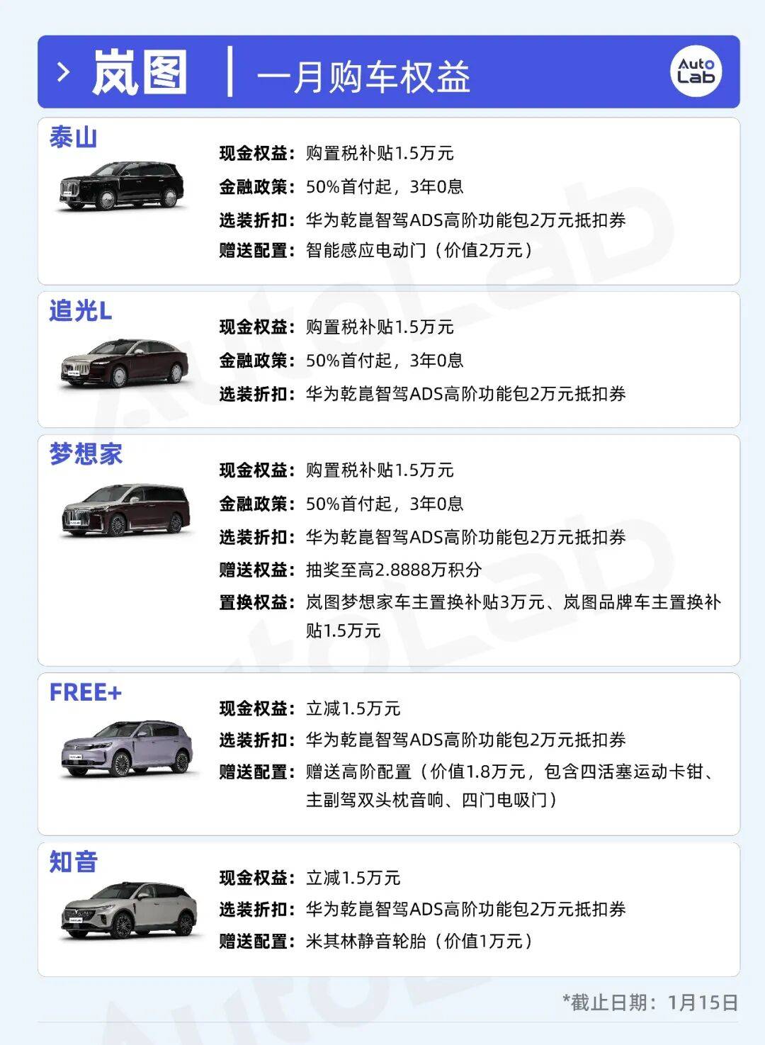 以岚图为例,旗下全系车型在1月15日前统一给出了1.5万元的现金优惠,策略相当直接。
