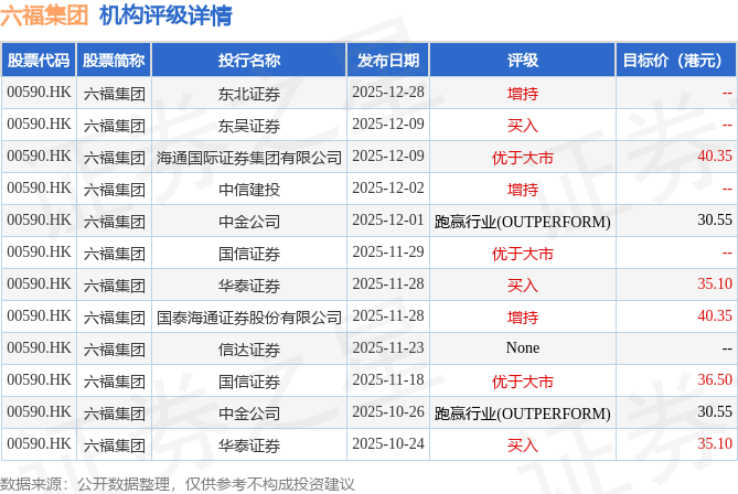 投行对该股的评级以增持为主,近90天内共有3家投行给出增持评级,近90天的目标均价为35.5港元。东北证券最新一份研报给予六福集团增持评级。