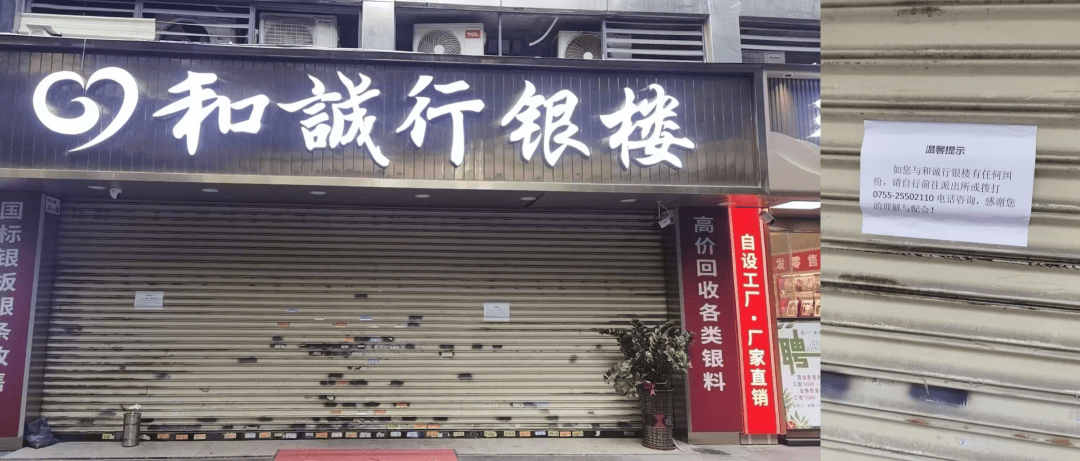 15日,该银楼大门紧闭,门口贴有告示称:若有纠纷,请前往派出所咨询。同样被波及的还有其位于长沙名汇达的店铺。蓝鲸记者从周边商铺处了解到,和诚行长沙名汇达店14日已关店歇业。
