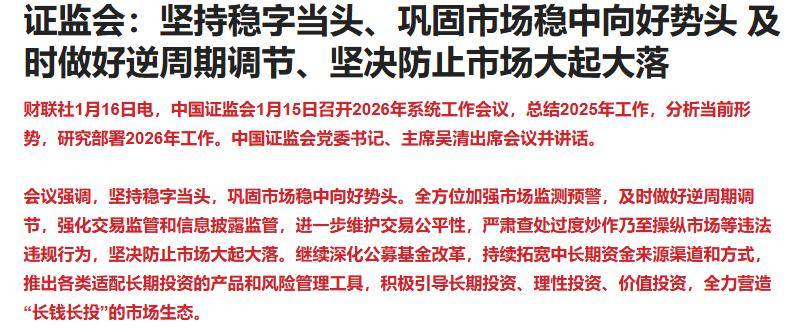 刚中国证监会1月15日召开2026年系统工作会议,会议强调严肃查处过度炒作乃至操纵市场等违法违规行为,坚决防止市场大起大落。短期内想复制商业航天、AI应用的疯狂炒作怕是很难了。