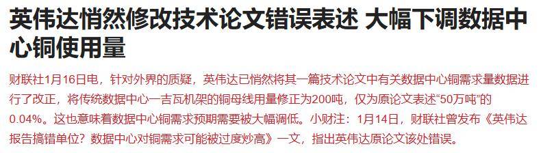 • 针对外界的质疑,英伟达已悄然将其一篇技术论文中有关数据中心铜需求量数据进行了改正,将传统数据中心一吉瓦机架的铜母线用量修正为200吨,仅为原论文表述“50万吨”的0.04%。这也意味着数据中心铜需求预期需要被大幅调低。