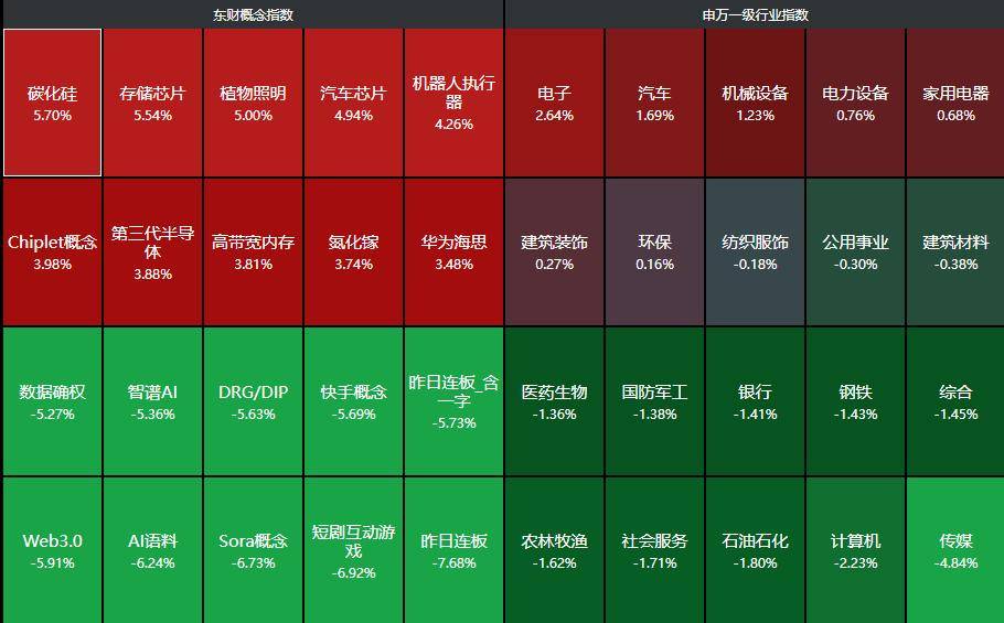 分行业来看,电子、汽车、机械设备、电力设备、家用电器等行业领涨,传媒、计算机、石油石化、社会服务、农林牧渔等行业领跌。