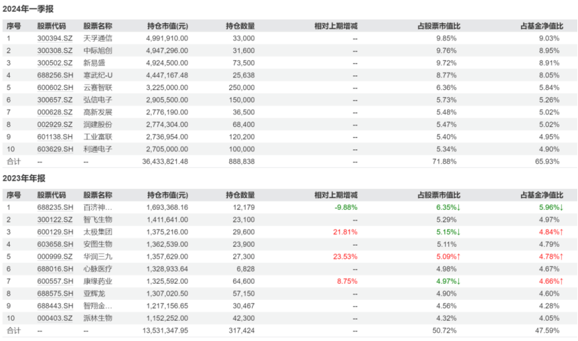 更值得警惕的是,相比一般指数基金有明确的选股与调仓规则,这些“工具基”作为主动管理型产品,换股自由度则高不少,投资预期稳定性同样存疑。例如德邦鑫星价值2023年末的前十大重仓股还是清一色的医药股,但2024年1月该产品更换基金经理,到2024年一季度末,该产品前十大重仓股已经全部换成AI算力概念股。