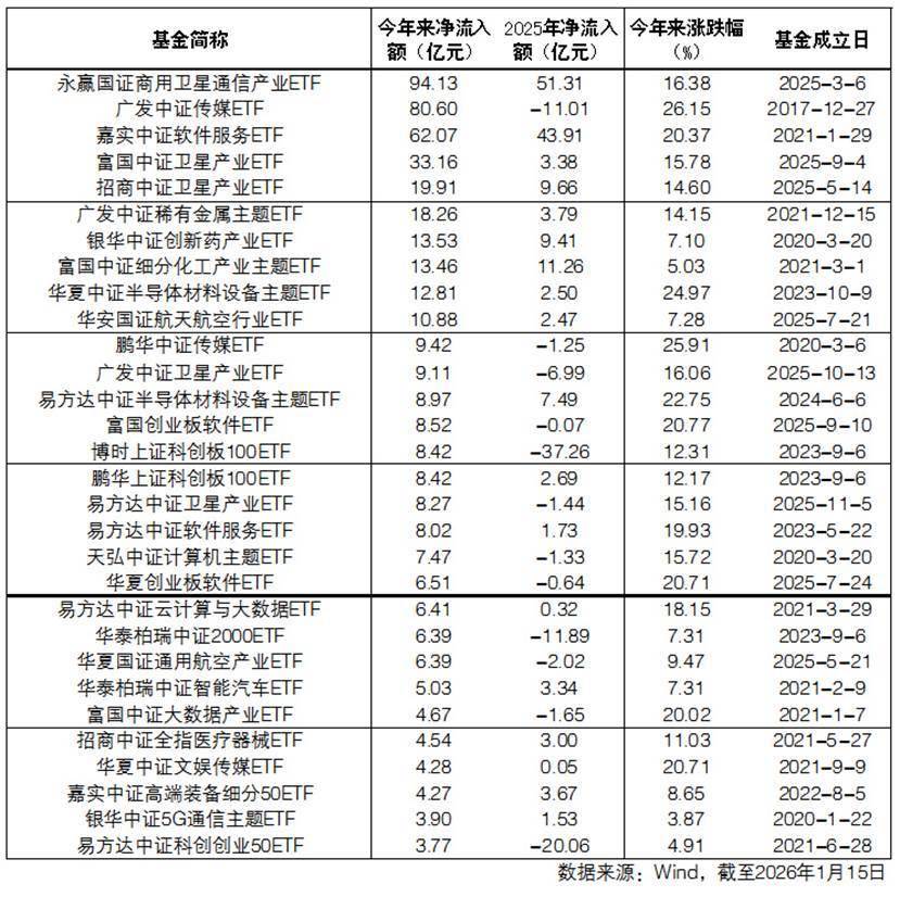 记者根据Wind数据统计发现,截至1月15日,今年以来有270只指数基金的场内资金净流入额已超过去年全年,其中净流入额最大的三只基金均是行业主题ETF,永赢国证商用卫星通信产业ETF今年来资金净流入94.13亿元,广发中证传媒ETF资金净流入80.60亿元,嘉实中证软件服务ETF资金净流入62.07亿元,均高于去年全年的资金净流入额。此外,富国中证卫星产业ETF、招商中证卫星产业ETF、广发中证稀有金属主题ETF、银华中证创新药产业ETF、富国中证细分化工产业主题ETF、华夏中证半导体材料设备主题ETF、华安国证航天航空行业ETF今年来的资金净流入额均超过10亿元。