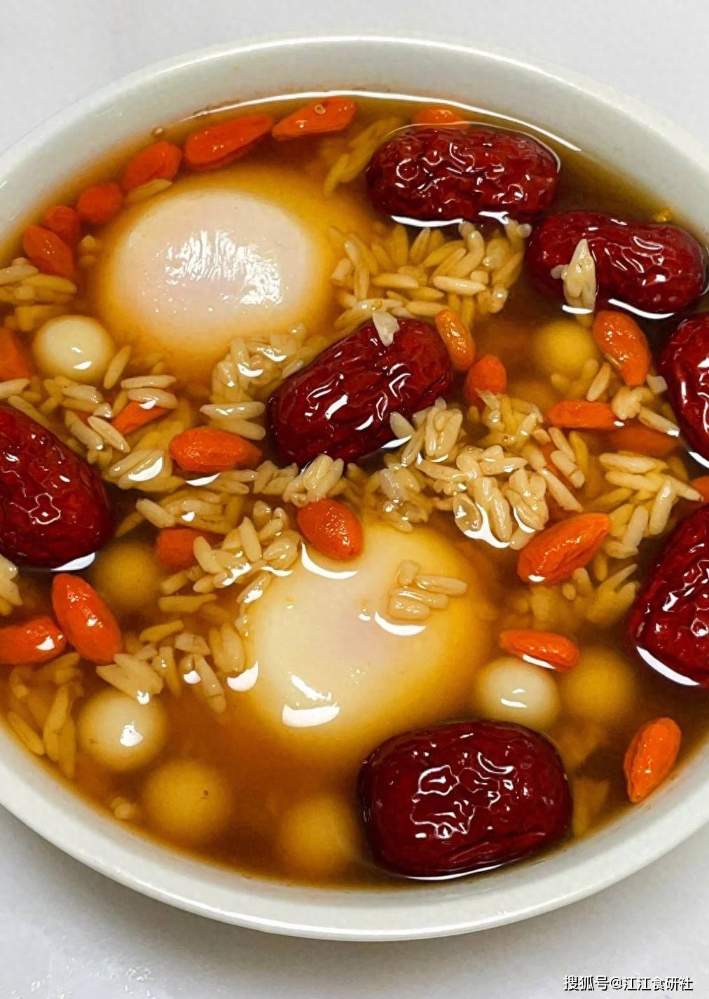 将煮好的荷包蛋放回汤里。撒上枸杞。关火,别开盖,焖3分钟。让蛋吸收汤的甜润,也让枸杞变软。