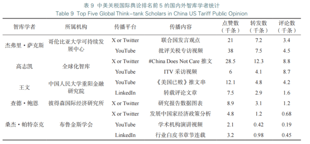 该文表示,根据爬虫程序抓取推特(现X)、油管、领英等三大海外社交媒体平台对“美中贸易或关税”(“US-China trade or tariff”“US China trade or tariff”)的转载与评论互动数据,对国际舆论场上的中国智库学者进行了排名,智库按官方、高校和社会分类。如表3所示,中国学者高志凯和中国人民大学重阳金融研究院院长、全球领导力学院院长王文作为我国智库学者代表,在中美经贸摩擦中的国际舆论场具有较高曝光度。