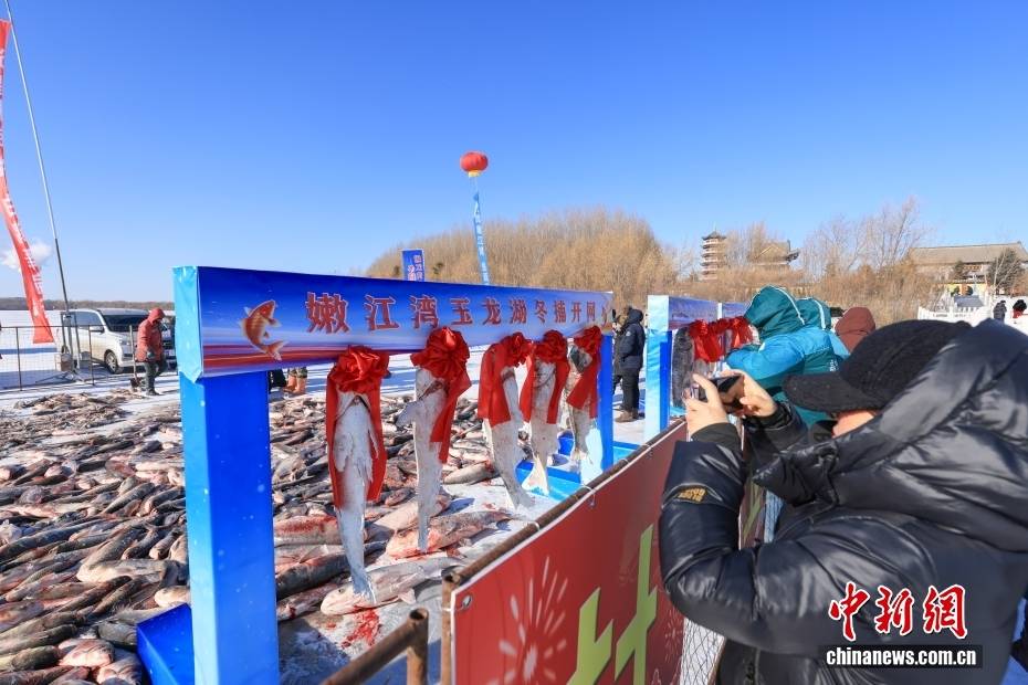 1月18日,吉林大安嫩江湾玉龙湖上,游客参观冬捕待售的鱼。近日,大安市各大渔场陆续进入冬捕黄金期。中新社记者 贾天勇 摄