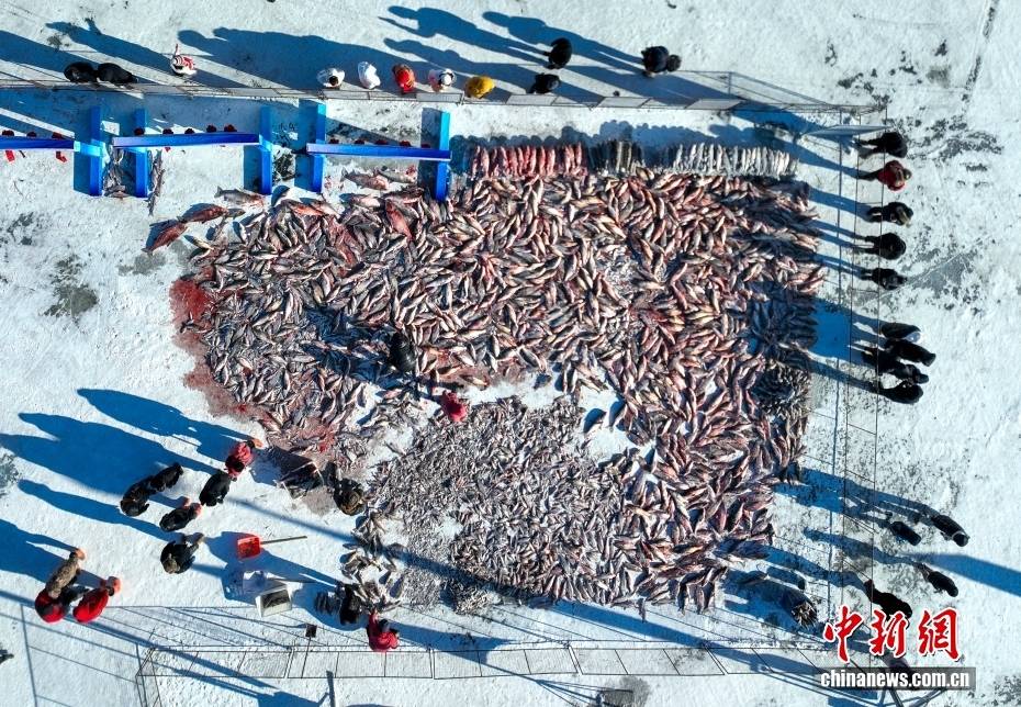1月18日,吉林大安嫩江湾玉龙湖上,刚刚冬捕收网的鱼摆放在冰面上。近日,大安市各大渔场陆续进入冬捕黄金期。(无人机照片)中新社记者 贾天勇 摄