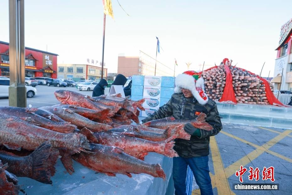 1月18日,吉林大安的渔业大集上,一名商户将刚刚冬捕的鲜鱼上架销售。近日,大安市各大渔场陆续进入冬捕黄金期。中新社记者 贾天勇 摄