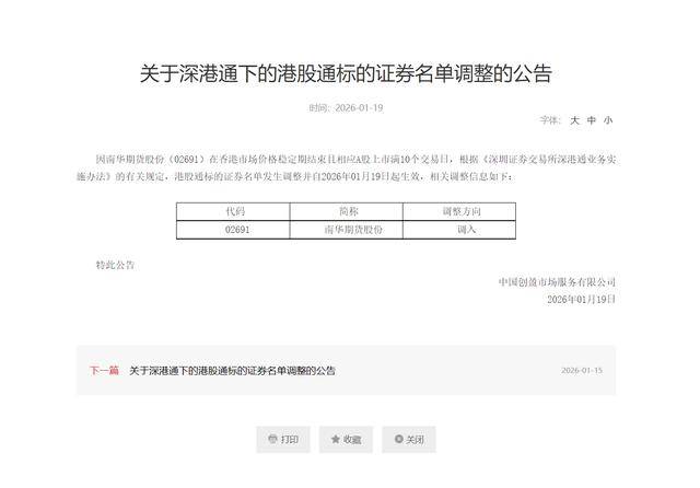 1月19日,深交所发布关于深港通下的港股通标的证券名单调整的公告。因南华期货股份(02691)在香港市场价格稳定期结束且相应A股上市满10个交易日,根据《深圳证券交易所深港通业务实施办法》的有关规定,港股通标的证券名单发生调整并自2026年01月19日起生效,调入南华期货股份。