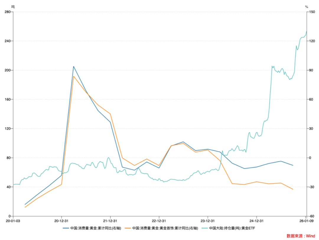 图:实物黄金消费量走低,ETF持仓量走高;资料来源:wind,36氪