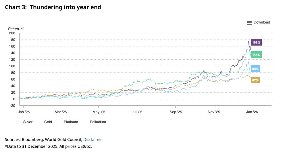银作为贵金属的重要品种,不仅具备与黄金类似的避险属性与储值属性,更在新能源、电子等产业中具有不可替代的工业用途。铜、铝等基本金属则是工业生产的核心原材料,直接关系到制造业、基建等关键领域的发展。各国对上述资源的囤积与储备,是推动相关金属价格的上涨的核心动能,而且白银、铂金、钯金等贵金属在2025年的表现均强于黄金。