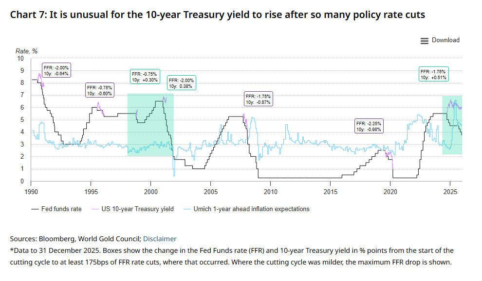 而美债在2025年丧失避险功能,倒逼避险资金流向黄金,则属于特殊历史背景下的结构性因素,特别是降息周期中美债利率出现上行的反常现象非常值得讨论。通常情况下,美债利率会随降息的深入而出现趋势性下行,这对美债投资者而言是十分明确的交易机会。